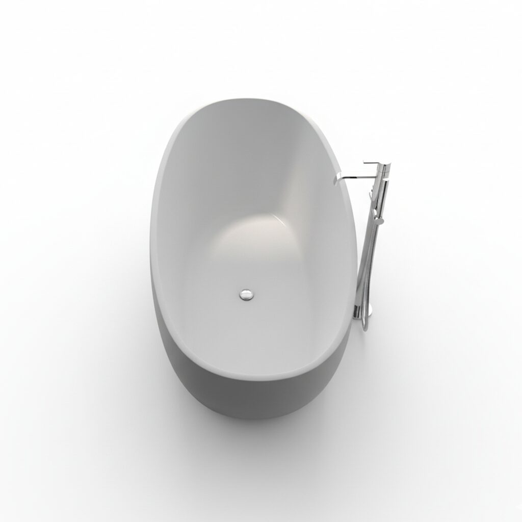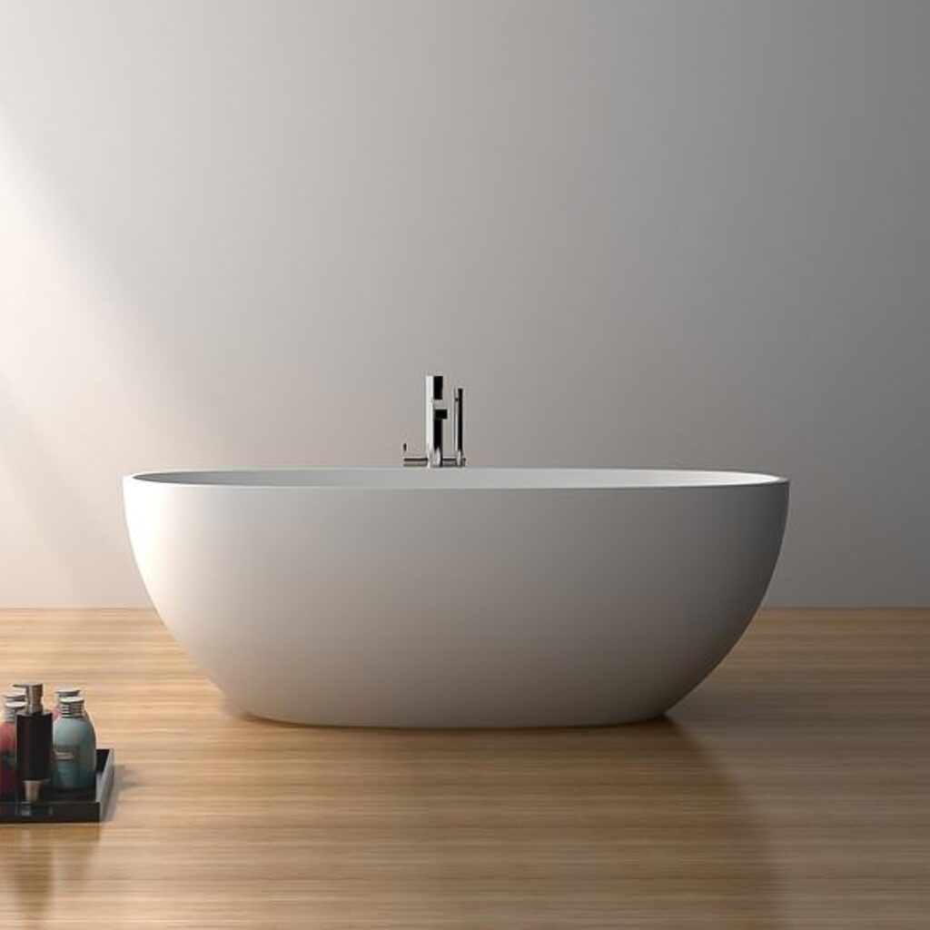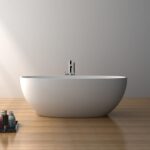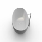 Die freistehende Badewanne Modell Carmen-165 ist aus Acrylguss (ähnlich Corian) gefertigt und verfügt über eine elegante Weiss matt Oberfläche, sowohl innen als auch aussen. Mit den großzügigen Maßen von 180 × 80 × 60 cm und einem Gewicht von 155 kg bietet diese Wanne ein komfortables Badeerlebnis. Sie kommt ohne internen Überlauf und fügt sich perfekt in jedes moderne Badezimmer ein.