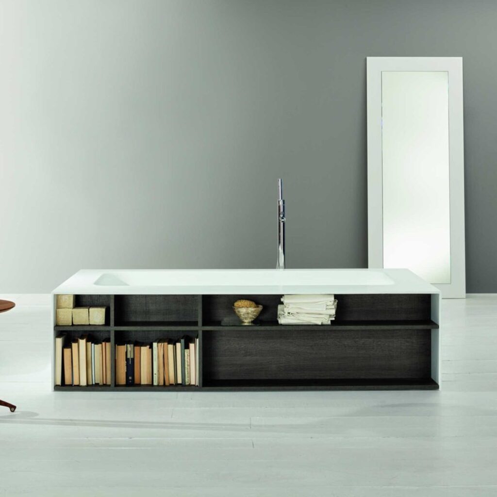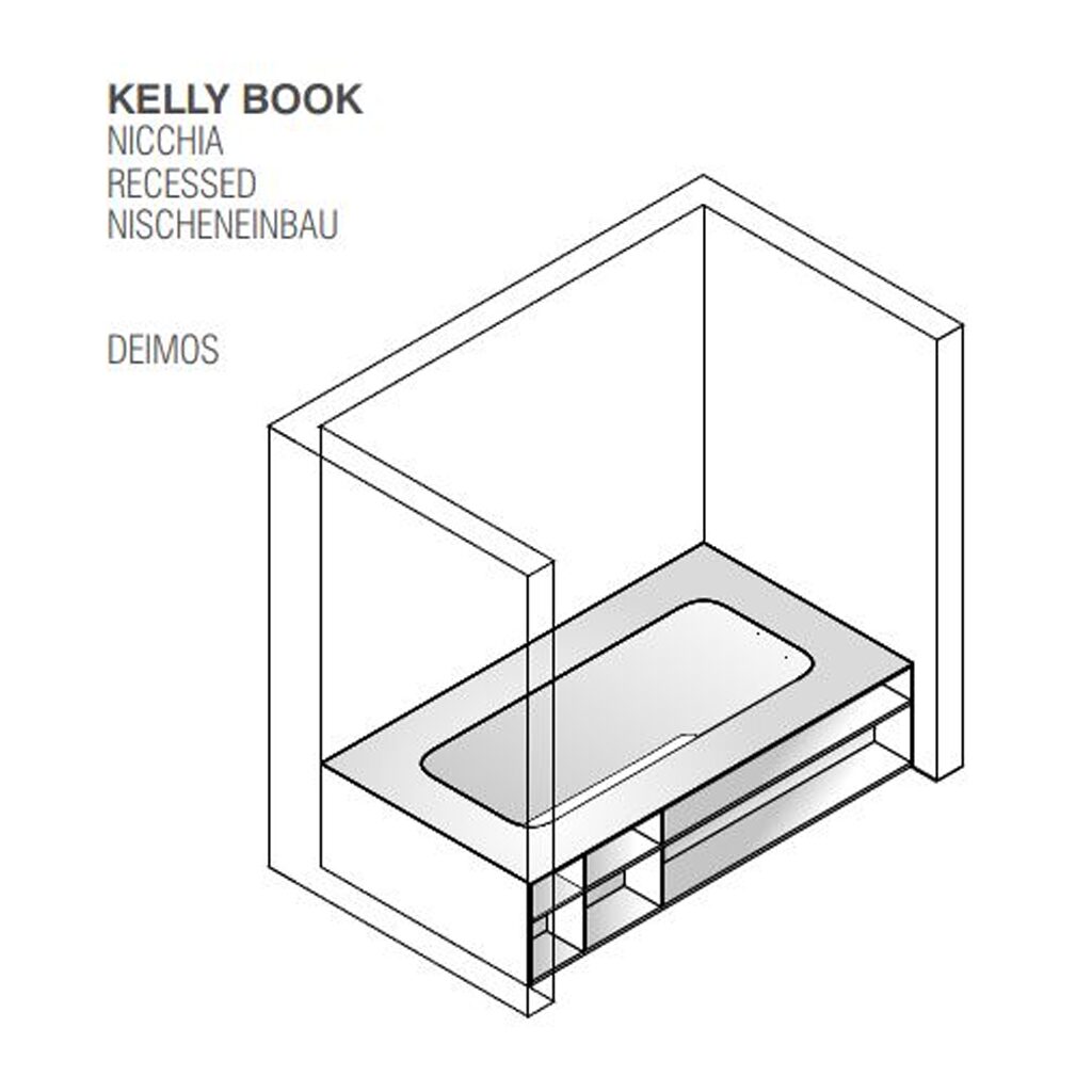 Design-Badewanne KELLY Book von MASTELLA (Italien) – für Einbau in Nischen, mit integriertem Bücherregal (matt lackiert). Optional in Hochglanz oder Metallic-Lack erhältlich (Preis auf Anfrage). Aus weiß mattem Cristalplant (Steinguss), gefertigt in einem Guss. Maßanfertigung: Länge 175–220 cm, Tiefe 75–120 cm, Höhe 51 cm, Volumen 274 Liter, Gewicht bis 212 kg. Mit internem Überlauf und Ablaufgarnitur.