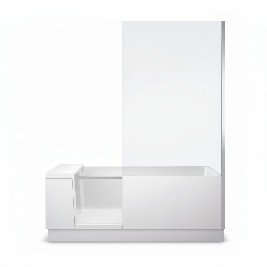 Die integrierte Tür lässt sich bei Bedarf öffnen, sodass der Einstieg besonders komfortabel ist. Wird sie nicht benötigt, kann sie einfach weggeklappt werden, wodurch sie vollständig hinter dem Sitzpad verschwindet. Das sorgt nicht nur für eine aufgeräumte Optik, sondern auch für mehr Bewegungsfreiheit im Bad.