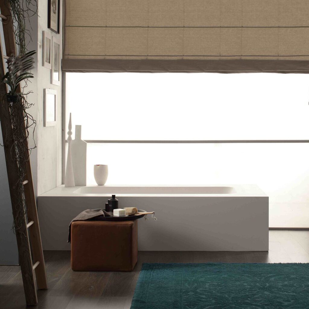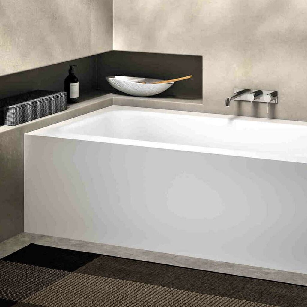 Exklusive wandstehende Badewanne Modell KELLY von MASTELLA (Italien), gefertigt aus weiß mattem Cristalplant (Steinguss). In einem Guss mit Badewannenumbau, ideal für wandnahe Platzierung. Maßanfertigung: Länge 175–220 cm, Tiefe 75–120 cm, Höhe 51 cm, Volumen 274 Liter, Gewicht bis 212 kg. Mit Überlaufschlitz und Ablaufgarnitur.
