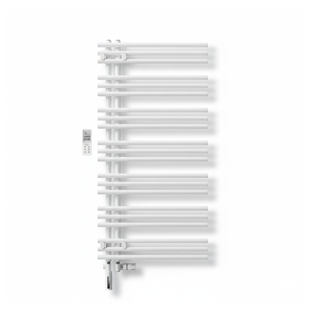 Der Badheizkörper Modell BEe aus der Badtherm-Serie sorgt mit einer Leistung von 600 Watt für effiziente Wärme. Dieser rein elektrische Heizkörper wird vorgefüllt geliefert und enthält eine Heizpatrone sowie einen Regler (Typ Slim, Weiss), die separat beigepackt sind und bauseitig montiert werden müssen. Gegen Aufpreis sind zusätzliche Reglerfunktionen erhältlich.