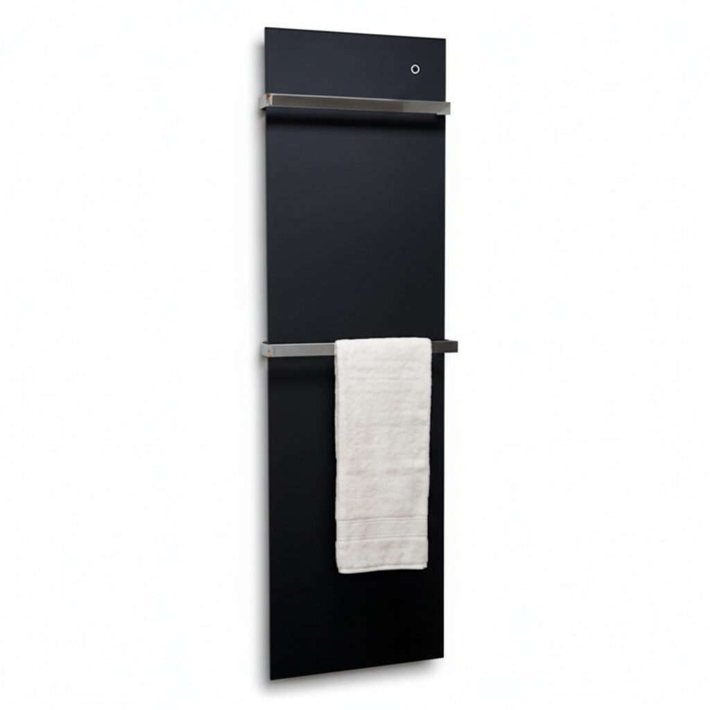 Ein stilvoller Glas-Badtuchwärmer mit matter Oberfläche, der durch modernes Design und clevere Technik überzeugt. Die Soft-Touch-Steuerung ermöglicht eine einfache Bedienung, während das minimalistische Erscheinungsbild in Schwarz matt perfekt in hochwertige Badarchitektur passt. Schweizer Qualität für zuverlässige Wärme und zeitlose Eleganz.