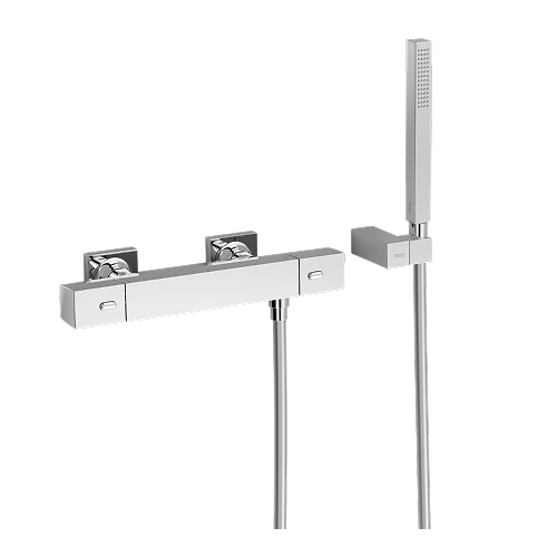 Der Mischer für Badewanne 2 Verbraucher AP TRES SLIM ist die perfekte Wahl für moderne Badezimmer. Mit seinem eleganten, eckigen Design und der glänzenden Chromoberfläche bringt er sowohl Stil als auch Funktionalität in Ihre Badewanne. Das Set umfasst einen hochwertigen Wannenmischer, eine Handbrause, einen flexiblen Schlauch und eine Wandhalterung – alles, was Sie für ein komfortables Duschen und Baden benötigen. Hergestellt von TRES, dem spanischen Marktführer, garantiert dieses Set eine lange Lebensdauer und zuverlässige Leistung.