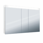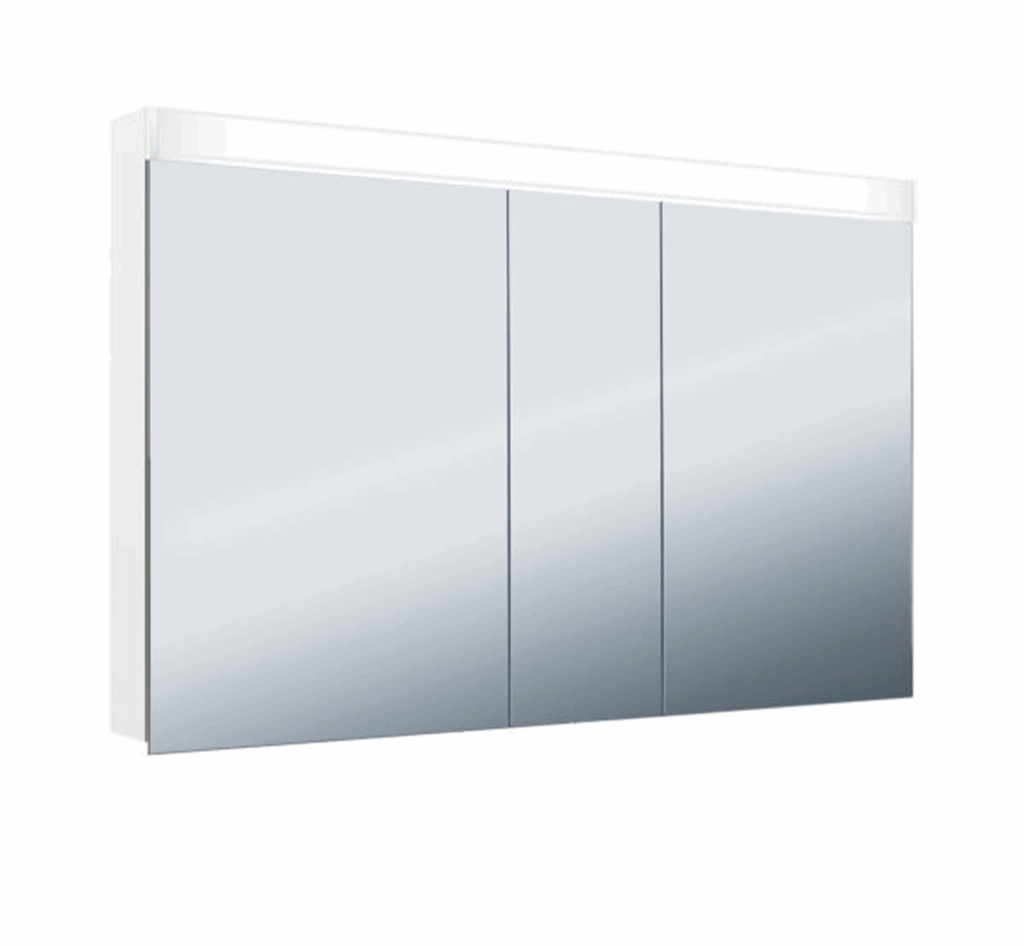 Dreitürig-Doppelspiegeltüre. Breite 150 cm. Höhe 76.5 cm Tiefe 12.5 cm (60/30/60). LED Beleuchtung (3000K oder 4000K). Licht nicht Dimmbar. Gehäuse; Aluminium-Profil beschichtet in weiss (100).